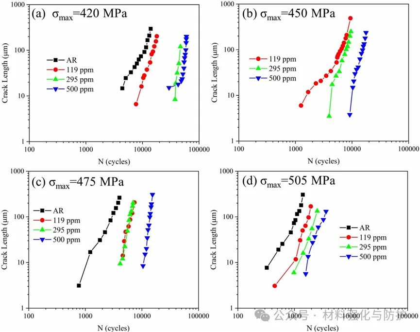 疲劳裂纹长度与最大应力σmax为(a) 420 MPa, (b) 450 MPa, (c) 475 MPa和(d) 505 MPa时的循环次数关系