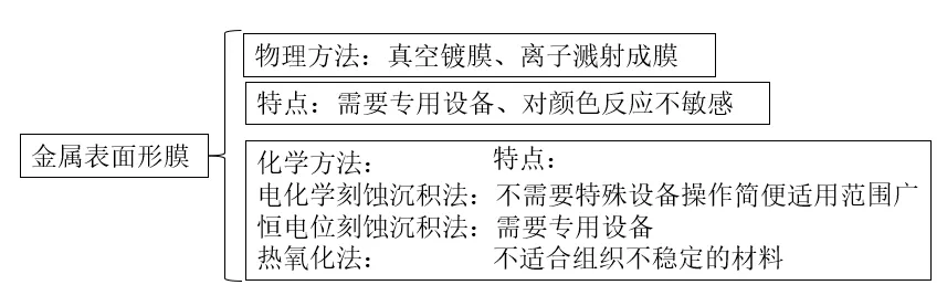 物理方法主要通过真空沉积技术在样品表面覆盖一层均匀的、高折射率的透明薄膜。 原理:在高真空环境下,加热一种高折射率的材料(如ZnSe, ZnS, MgF₂),使其蒸发并以蒸汽形式均匀地沉积在旋转的样品表面,形成一层厚度一致的薄膜。颜色的差异来自于样品表面不同区域本身的光学性质(对光的吸收率不同)与这层 uniform 薄膜共同作用产生的干涉效果。 操作步骤: 样品制备:标准磨制、抛光,并且必须进行深度浸蚀以凸出相衬,因为物理膜本身不会选择性沉积。 放入真空室:将样品放入真空镀膜机的样品台上。 抽真空:将真空室抽至高真空(通常优于10⁻³ Pa)。 蒸镀:加热蒸发源(如钨篮中的ZnSe),同时让样品台缓慢旋转,确保膜厚均匀。通过控制蒸发时间和功率来控制膜厚。 取出的观察:待真空室恢复常压后取出样品,直接观察。 原理:在低真空室中充入惰性气体(如氩气),施加高压使气体电离产生等离子体。氩离子在电场作用下轰击靶材(如金、铂),将其原子溅射出来并沉积在样品表面。此方法形成的膜更薄、更均匀。 操作步骤:与真空蒸镀类似,但设备是离子溅射仪。过程更快(通常几十秒到几分钟),常用于扫描电镜(SEM)样品制备以消除电荷,同样适用于光学显微镜的彩色金相。物理方法 (Physical Methods)