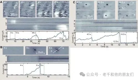 图 1A 是腐蚀刚开始时,这款显微镜拍摄视频里的四张截图,同时还附上了两条线段上的点蚀变化时空图,以及同步检测的电流曲线。从截图里能看到,金属表面有范围达 100 微米的亮区,亮度从中心向边缘慢慢变弱。
