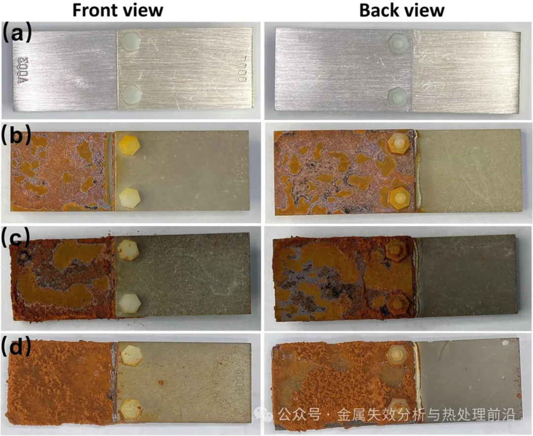 图6.Q235钢与BFe30-1–1铜镍合金电偶腐蚀形貌示意图:(a)耦合后即刻;(b)腐蚀30天后;(c)腐蚀60天后;(d)腐蚀90天后。