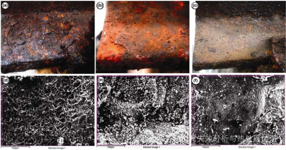图3. 不同牌号钢轨轨底经六个月盐雾暴露后发生均匀腐蚀的宏观照片及其对应的扫描电镜(SEM)微观组织特征:(a, d)C–Mn钢;(b, e)Cu–Mo钢;(c, f)Cr–Cu–N钢