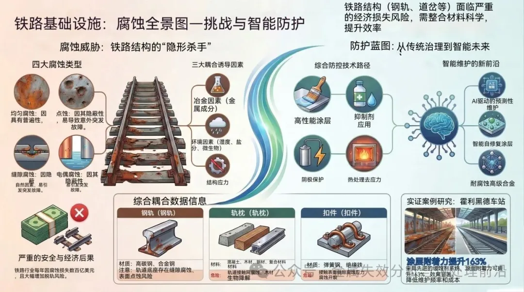 作为深耕工程材料与失效分析领域的从业者,本文将系统性地穿透表象,深度剖析铁路关键部件所面临的复杂腐蚀机理,并探讨当前及未来旨在提升基础设施耐久性的前沿防护体系。