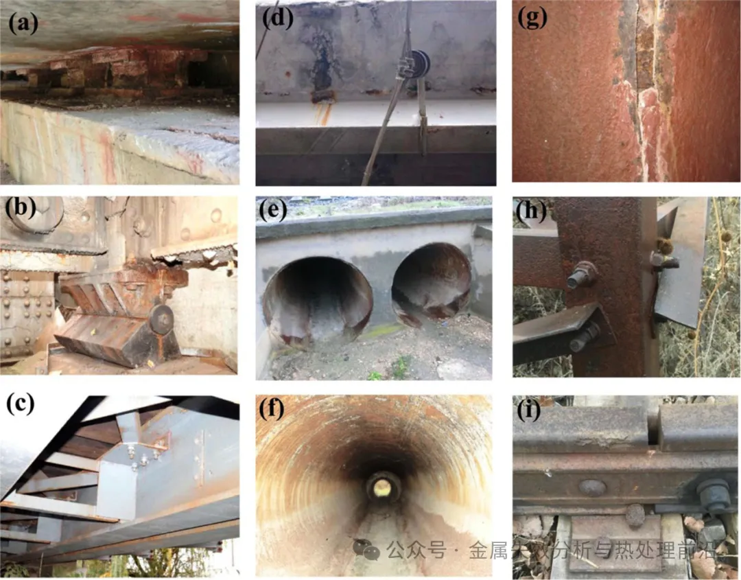 此类失效后果严重,不仅对乘客及货物安全构成重大威胁,还会因维修、更换及停运造成巨额经济损失。图2展示了铁路结构不同部位存在的一些腐蚀缺陷。