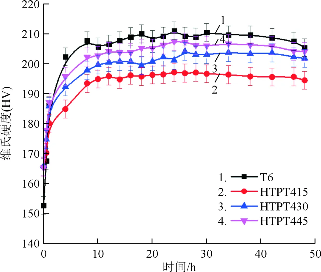图1 AlZnMgCu合金随炉升温过程温度和电导率的拟合曲线 图2 高温预时效处理工艺时效时间-硬度曲线 图3 不同状态下合金的抗拉强度 图4 T6和HTPT处理后合金的剥落腐蚀横截面照片