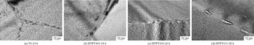 通过高倍透射电镜观察晶界,研究揭示了性能差异的根源。传统T6工艺后,晶界析出相细小且密集,容易成为腐蚀通道。而经过高温预时效(特别是430℃和445℃)后,晶界析出相明显长大、间距变宽、分布变得稀疏。这种结构能有效阻碍腐蚀沿晶界扩展,从而大幅提升耐蚀性。同时,晶内强化相受影响较小,因此力学性能得以较好保留。