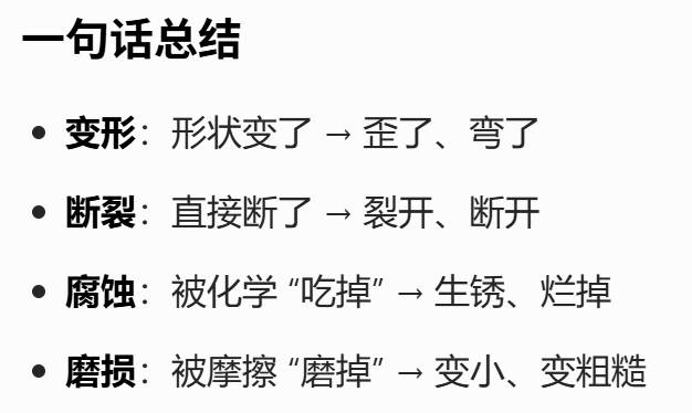 本科基础课程《机械设计》这门课中介绍说,材料的失效形式有四类:变形、断裂、腐蚀、磨损。