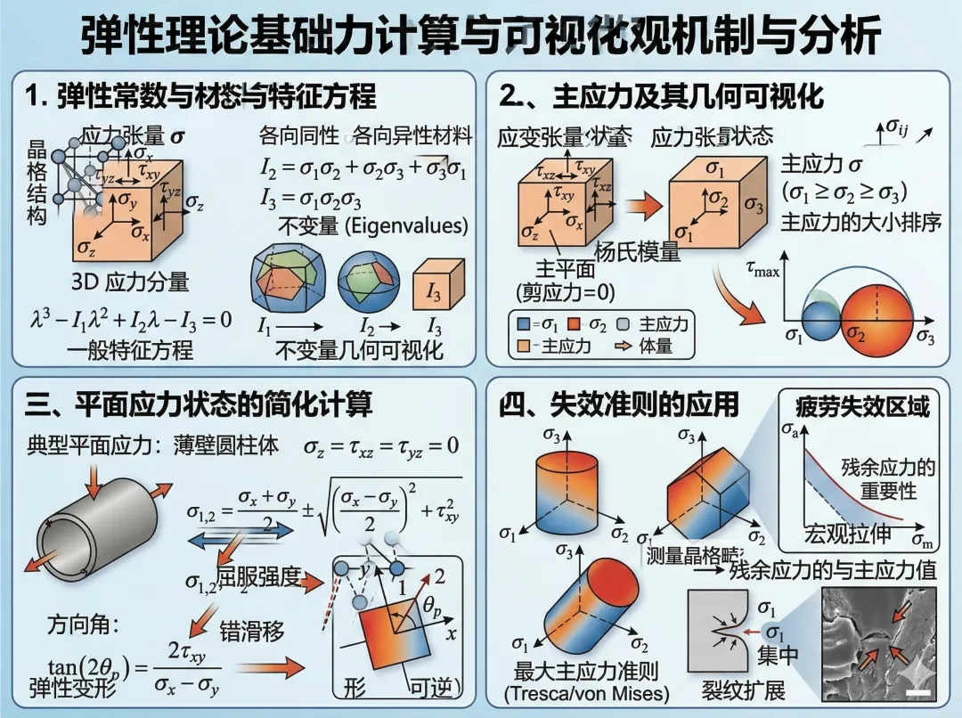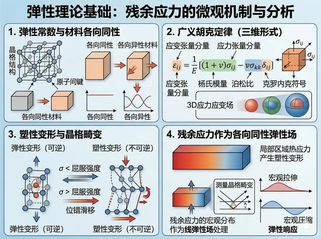 这一关系式是残余应力测量和分析的理论基础。无论是通过X射线衍射测量晶格应变,还是通过有限元分析计算应力分布,都需要用到这一基本关系。