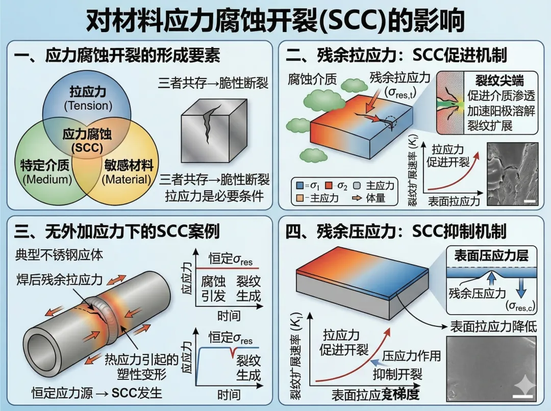 相反,残余压应力对抑制应力腐蚀开裂具有积极作用。残余压应力能够降低或消除表面拉应力,从而减小应力腐蚀开裂的驱动力。