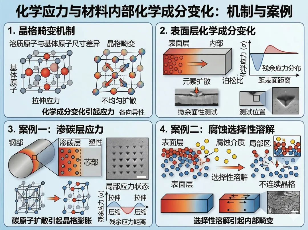 化学应力与材料内部的化学成分变化有关。当表面层的化学成分发生变化时,由于溶质原子与基体原子尺寸差异引起的晶格畸变,会产生化学应力。此外,腐蚀过程中的选择性溶解也可能引起化学残余应力。