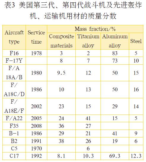 进入20 世纪80 年代后,民用飞机用钛逐步增加,并已超过军用飞机用钛。飞机越先进,钛用量越多。表3~5 所列分别为美国第3 代、第4 代战斗机及先进轰炸机、运输机用钛材的质量分数 、一般飞机使用的钛合金种类和空客飞机钛合金和复合材料的用量。由表5 可知,空客A380 飞机上的钛材使用量已达10%,钛材已经成为现代飞机不可缺少的结构材料。根据用途不同,可将航空用钛合金分为飞机发动机用钛合金、飞机机身用钛合金和航空紧固件用钛合金。近年来,人们对航空用钛合金在上述 3 个方面的应用进行了深入研究。
