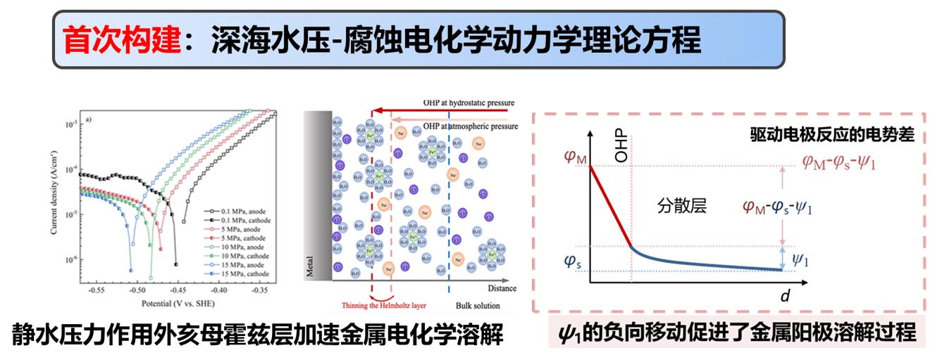 建立“深海力学-电化学”多因素交互作用腐蚀机理,首次构建深海水压-腐蚀电化学动力学理论方程,明确深海水压下金属溶解过程的电极反应速度理论调控方法;阐明深海压力对防护涂层界面破坏,及涂层/金属界面电化学协同失效机理,为深海耐蚀金属、防腐涂层成分/结构设计奠定理论基础。