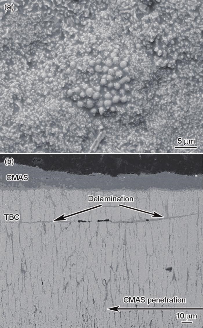 高温腐蚀也是是热障涂层失效的一个重要原因。航空飞机执行任务的实际工况中,发动机会摄入大量沙尘、火山灰、跑道碎屑以及各种环境污染物,这些吸入物在高温下附着于发动机热端部件(如涡轮叶片、燃烧室壁等);研究发现沉积物的成分主要为CaO、MgO、Al2O3和SiO2,简称CMAS。CMAS的熔点随成分变化而变化,但一般来说,当工作温度超过1200℃时,CMAS即开始熔化,高温熔体会沿着叶片表面TBCs中微裂纹、孔隙内渗,同时与涂层组分反应,造成涂层相成分和微观结构破坏,加速涂层失效,使得叶片合金直面高温燃气,损害发动机性能。