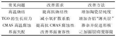 为了改善热障涂层性能,人们进行了大量的探索和研究。下表是影响 YSZ 涂层服役寿命的常见问题及其改善需求、改善方法。