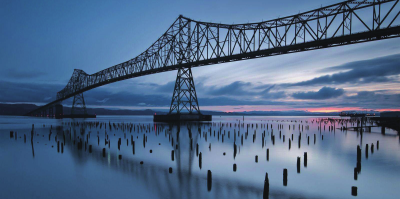 "20 世纪 30 年代建造的美国俄勒冈州Alsea 海湾上的多拱大桥,施工..."