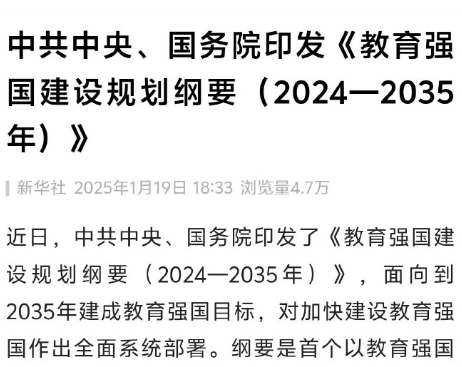 "近日,中共中央、国务院印发了《教育强国建设规划纲要(2024-2035年)..."