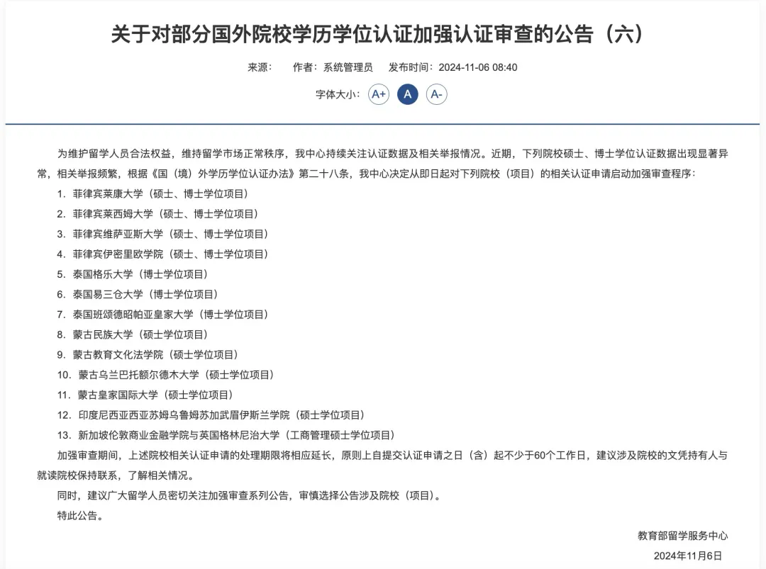 "2024年11月6日,教育部留学服务中心在其官网发布公告,对部分国外院..."