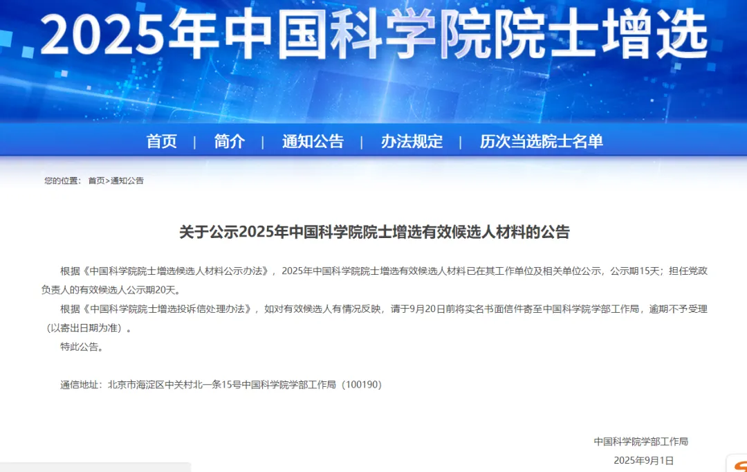 "根据《中国科学院院士增选候选人材料公示办法》,2025年中国科学院..."