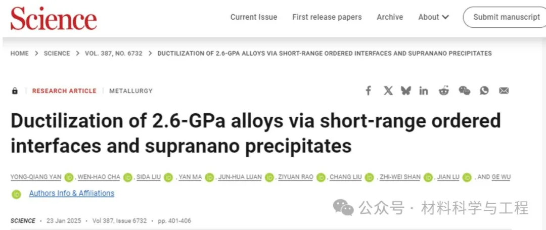 西安交大&香港城大《Science》:2.6GPa!超高强合金的韧化设计新突破!