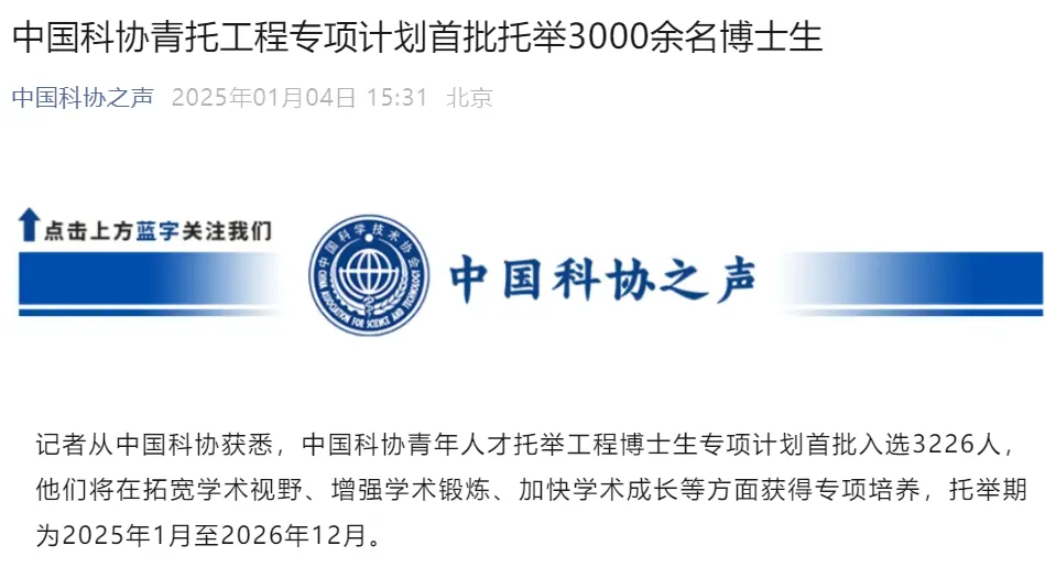 "据中国科协之声援引新华社消息,中国科协青年人才托举工程博士生专..."