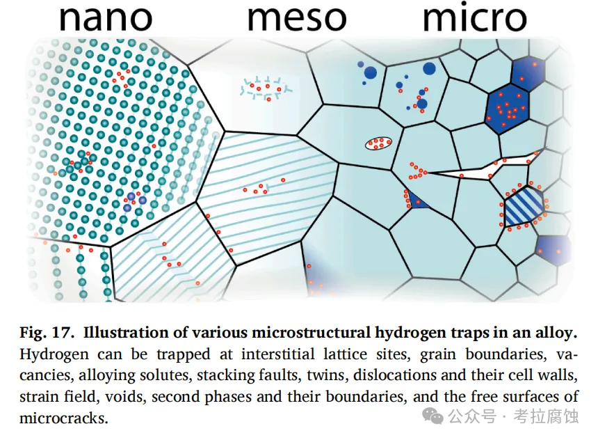 "主要展示了合金中不同微观结构的氢陷阱示意图,从左到右分为nano(纳..."