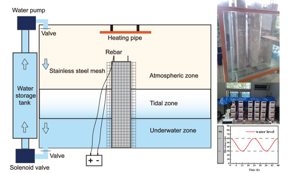 "将钢筋混凝土桩置于室内海洋环境模拟系统,通电加速锈蚀使其达到5%..."